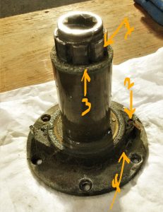As the photo to the right shows this is a winch that hasn’t been cleaned in a number of years. Item #1 the pawl ratchet on the main shaft is caked with old lubricate which can result in the pawls not seating or slipping. Item #2 the pawl is heavily corroded and on this winch all four pawls were very sticky thus the drum was in danger of rotating backwards which could result in a line loosing tension at a critical moment. Item #3 corrosion around the top of the bearing pedestal causing the shaft to stick. Item #4 build up of dirt around the pawl pocket and the base of the winch.