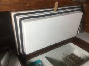 I first wrote about building a new lid for Malaya’s refer back in February of 2018, in that article I wrote about building a plug for a fiberglass part, https://oldsaltcruising.com2018/02/09/new-refer-lid/, since then the lid has long been finished and in the ensuing months I have had plenty of opportunity to run the refer and test the new lid. The results have been overwhelmingly positive, compressor run time as well as amps used are down and best of all the freezer plate no longer ices up!